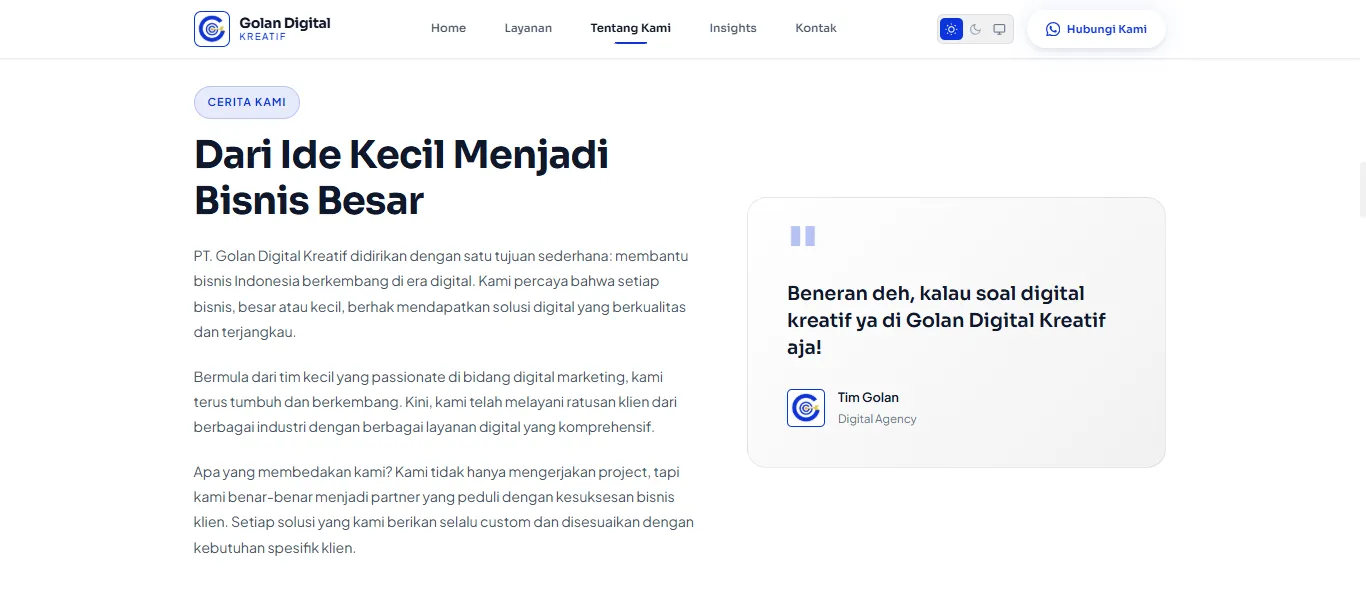 Premium Company Profile & Blog adalah website landing page utuh yang dirancang khusus untuk kebutuhan branding perusahaan, agensi, maupun profesional. Website ini hadir sebagai solusi bagi Anda yang menginginkan kehadiran digital yang kredibel, elegan, dan fungsional tanpa harus membangun dari nol.